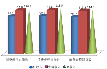 根据上海财经大学应用统计研究中心最新调查结果显示,上海市消费者的消费信心随不同收入水平和不同年龄段呈现出不同水平。2013年第四季度低收入群体消费者信心指数为98.1点,而中高收入群体分别为114.0点和116.3点。其中,消费者评价指数的情况为低收入群体为99.5点,中等收入消费者为114.9点,高收入消费者为118.5点;消费者预期指数低中高收入群体分别为96.7点、113.2点和114.0点。各主要指数均呈现出了依收入水平从低到高递增的态势,但低收入群体的消费信心和对经济的评价以及预期又回到了中性值100点以下。