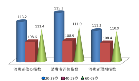 在分年龄段的调查中,20—39岁的消费者在三项主要指数中得分最高,分别为113.2点、115.3点和111.2点,而中间年龄段即40—59岁年龄组的指数虽然总体来看依然是最低的,分别为108.6点、108.9点和108.4点,但较上个季度上升幅度较大,分别上涨了7.3点、6.5点和8.1点,尤其是购买意愿指数和购买预期指数环比分别增加了8.2点和14.3点,达到了77.5点和63.0点,这主要是由于其中的买房时机指数和买车时机指数大幅增加决定的。在历次调查中,该年龄段的消费者属于消费心理较为谨慎的群体,但在收入预期增加和抵御通胀的内在动力以及房价坚挺和汽车限购的外在压力下,该年龄段的购车意愿和改善性住房需求增加,带动了整体指数的上升,但这种上升可能不具备长效性,因此还是应该以完善收入分配制度和加强社会保障为抓手,从整体上提振消费者对经济发展的信心,增强其消费能力。