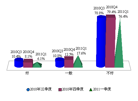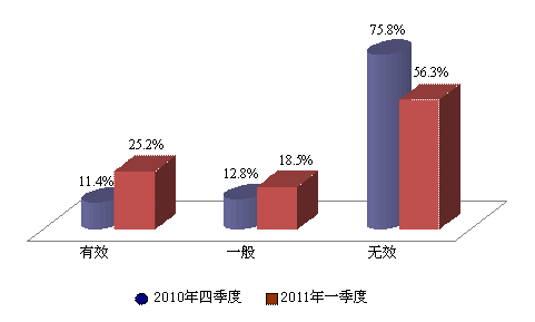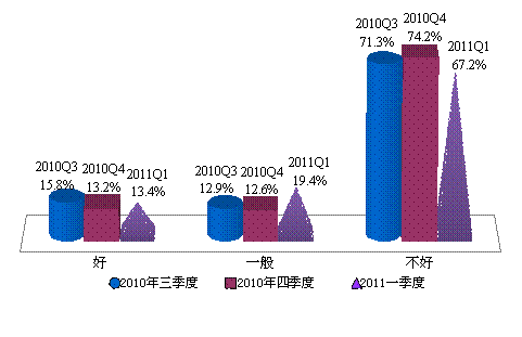 上海财经大学应用统计研究中心主任徐国祥教授和崔畅副教授分析指出,对比第三次调控前后的2010年的第四季度和本季度的调查结果可以发现,在本季度的调查中,25.2%的受访者认为房地产市场调控的政策有效,环比上升幅度较大,为13.8点,只有56.3%的消费者对该项工作的评价投了不满意票,比上季度大幅下降了19.5个点。第三轮房地产市场的调控力度空前,如果能将其常态化、制度化,并切实保证地方政府的贯彻执行力度,应该对市场产生深远的影响,消费者对此次调控的满意度明显高于从前,导致消费者对政策的好评比处于近四个季度的最高点,而且预期购买动机亦有所上升。