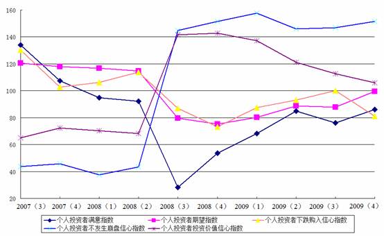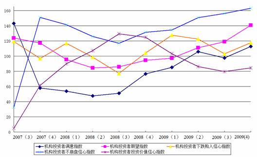 根据上海财经大学应用统计研究中心的调查,2009年第四季度上海市机构投资者信心指数为121.85点,较上季度上升了12.4点,上海市个人投资者信心指数为104.85点,较上季度略微上升了0.15点,两者均持续处于中性值100点的上方,说明投资者的信心仍然维持乐观。