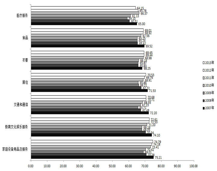2013年在被调查的七个大类消费品和服务中,按照满意度指数由高到低排序,依次为:家庭设备用品及服务类74.79点,教育文化娱乐服务类72.61点,交通和通信类70.68点,居住类70.53点,衣着类69.45点,食品类69.01点,医疗服务类64.15点。这说明上海市民对家庭设备用品及服务类和教育文化娱乐服务类的满意程度较高,而对医疗服务类和食品类的满意程度较低。与2012年相比,七个大类消费品和服务满意度指数排序没有变化。