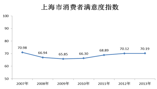 上海财经大学应用统计研究中心调查显示,2013年上海财经大学上海市消费者满意度指数为70.19点,超过中性值50点,总体而言上海市民对所消费的产品和服务基本满意。与2012年上海市消费者满意度指数(70.12点)相比,2013年上海市消费者满意度指数上升了0.07点。上海市消费者满意度指数自2007年首次调查以来,连续2年下降,并于2009年达到最低值,为65.85点。2010年至今,呈现不断回升的态势,已连续4年上升。