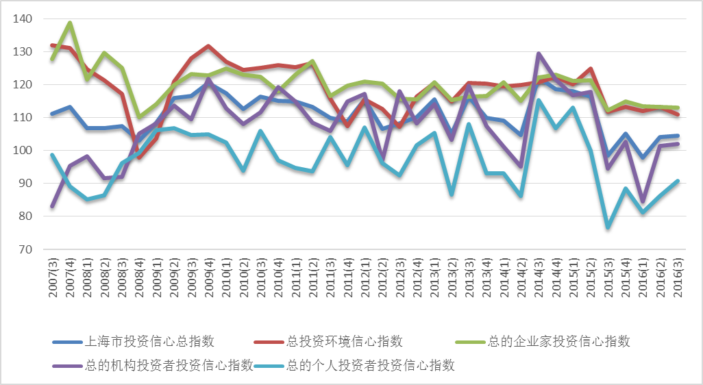 上海财经大学应用统计研究中心对上海市企业领导人或企业家、机构投资者和个人投资者的调查结果显示,2016年第三季度上海财经大学上海市投资者信心指数为104.51点,环比上升0.36点,同比上升5.92点。指数位于乐观区域,表明上海市投资者心态较为积极稳定。