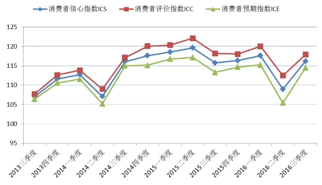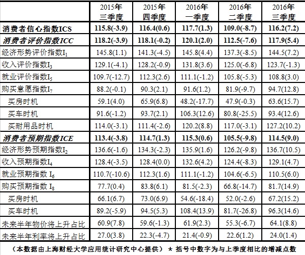 根据上海财经大学应用统计研究中心最新调查结果显示,2016年第三季度上海财经大学上海市消费者信心指数为116.2点,环比上涨7.2点,同比基本持平,略增加0.4点。其中,消费者评价指数为117.9点,较上季度增长5.4点,同比略降0.3点。消费者预期指数为114.5点,环比增加9.0点,同比上涨1.1点,具体数据见附表1。