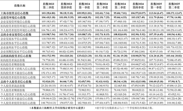 根据上海社会调查研究中心上财分中心和上海财经大学应用统计研究中心对上海市企业领导人或企业家、机构投资者和个人投资者的最新调查结果显示,2025年第二季度上海财经大学上海市投资者信心指数为100.37点,环比下降12.67点,同比下降2.24点,表明上海市投资者情绪不如前期乐观。