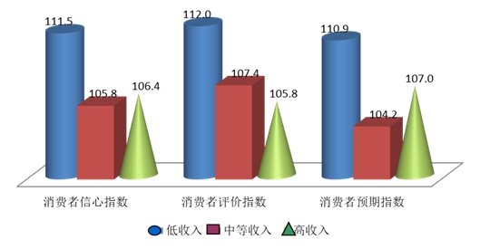 根据上海社会调查研究中心上财分中心和上海财经大学应用统计研究中心最新调查结果显示,消费者的消费信心随不同收入水平和不同年龄段呈现出不同水平。本季度高收入群体在三个主要指数中再次领跑,超过了中低收入群体,这在历次调查中较为少见。本季度上海市低中高收入者的消费信心指数分别为111.5点、105.8点和106.4点,消费者评价指数的情况为:低收入群体为112.0点,中等收入消费者为107.4点,高收入消费者为105.8点;而消费者预期指数低中高收入群体分别为110.9点、104.2点和107.0点。三个收入群体的各主要指数均高于中性值100点,但比较而言,低收入群体的各项指数最高。