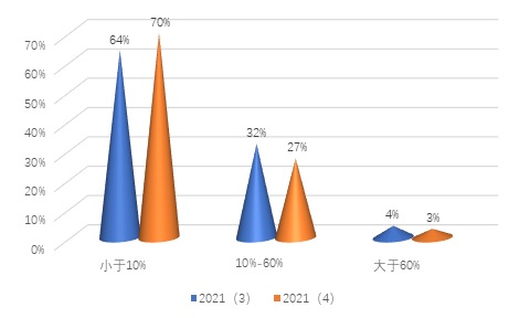 本季度个人投资者不崩盘信心指数有所回升。在关于“您认为未来三个月内大盘指数下跌30%的概率是多少”的调查中,认为小于10%的占比从64%升至70%,认为10%-60%的占比由32%降至27%,认为大于60%的占比由4%降至3%,具体如图9所示。