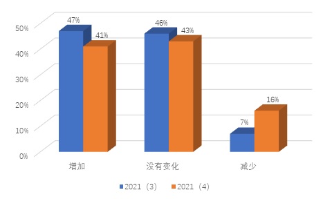 本季度机构投资者下跌购入信心指数也大幅下降。在关于“与上月相比,您在股票方面的投资额度有什么变化”的调查中,表示将会增加很多的受访者占比由6%降至3%,表示将会有所增加的受访者占比由36%降至25%,表示不会有变化的受访者占比由48%升至58%,表示将会有减少的受访者占比由9%升至14%,具体如图6所示。
