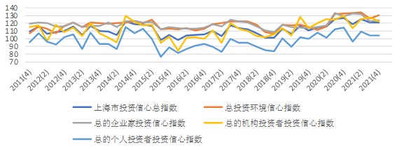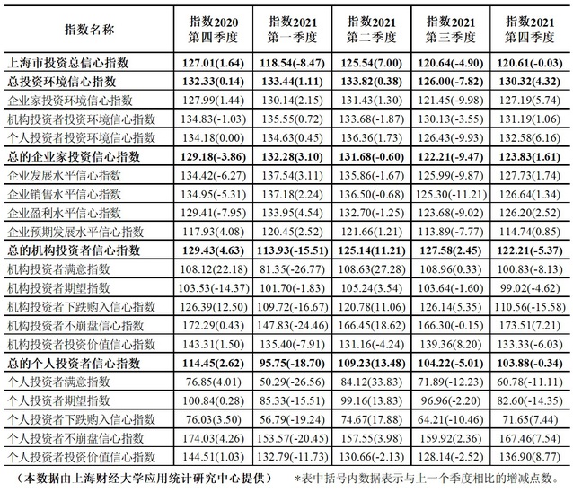 根据上海社会调查研究中心上财分中心和上海财经大学应用统计研究中心对上海市企业领导人或企业家、机构投资者和个人投资者的调查结果显示,2021年第四季度上海财经大学上海市投资者信心指数为120.61点,环比持平,同比下降6.40点。指数持平,表明上海市投资者心态乐观稳定。