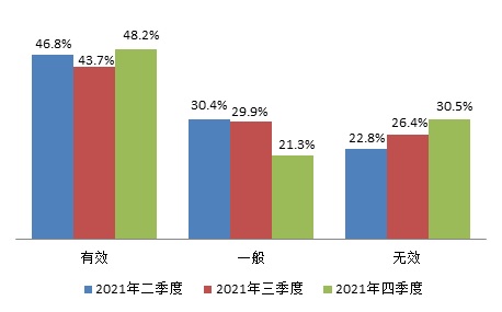 在本季度的调查中,48.2%的受访者认为房地产市场调控的政策有效,环比和同比双双增加了4.5个百分点和8.8个百分点,处于较高点位,且是近两年来的最高点。同时,30.5%的消费者对该项工作的评价投了不满意票,比上季度亦增加了4.1个百分点,同比上升2.3个百分点,本季度消费者对调控效果的满意度出现了分歧,但从购买类指数看,消费者的买房需求有大量释放的意愿,市场运行平稳,价格有下行态势,因此消费者对调控效果总体上较为满意。