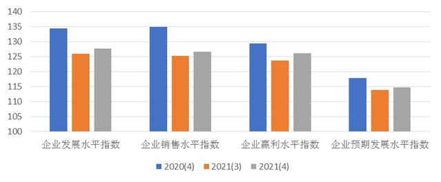 上海市企业家投资信心指数反映企业家对于本企业生产经营现状的满意程度和对未来的预期。如图4所示,本季度企业家投资信心指数的分类指数表现较上一季度有所上升,其中表现当前企业发展状况的企业发展水平信心指数为127.73点,与上季度相比上升1.74点,同比下降6.69点;反映企业销售水平的企业销售水平信心指数为126.64点,环比上升1.34点,同比下降8.31点;企业盈利水平信心指数为126.20点,环比上升2.52点,同比下降3.21点。企业预期发展水平信心指数为114.74点,环比持平,同比下降3.19点。