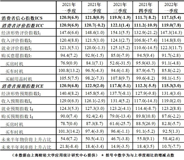 2022年第一季度上海财经大学上海市消费者信心指数及分类指数