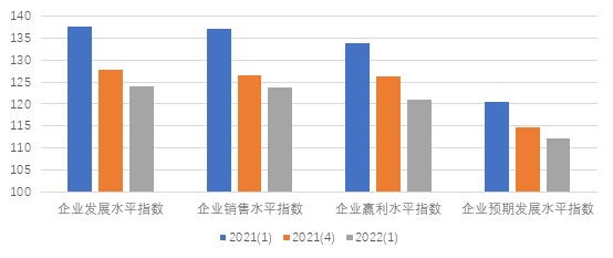 上海市企业家投资信心指数反映企业家对于本企业生产经营现状的满意程度和对未来的预期。如图3所示,本季度企业家投资信心指数的分类指数均呈现下降态势,其中表现当前企业发展状况的企业发展水平信心指数为124.00点,与上季度相比下降3.72点,同比下降13.53点;反映企业销售水平的企业销售水平信心指数为123.67点,环比下降2.96点,同比下降13.51点;企业盈利水平信心指数为121.09点,环比下降5.11点,同比下降12.86点。企业预期发展水平信心指数为112.06点,环比下降2.68,同比下降8.39点。