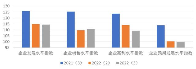 上海市企业家投资信心指数反映企业家对于本企业生产经营现状的满意程度和对未来的预期。如图3所示,本季度企业家投资信心指数的分类指数除企业盈利水平信心指数外其余指数基本未变,其中表现当前企业发展状况的企业发展水平信心指数为114.52点,与上季度持平,同比下降11.48点;反映企业销售水平的企业销售水平信心指数为110.67点,环比持平,同比下降14.63点;企业盈利水平信心指数为109.25点,环比下降4.84点,同比下降14.43点。企业预期发展水平信心指数为100.12点,环比持平,同比下降13.76点。