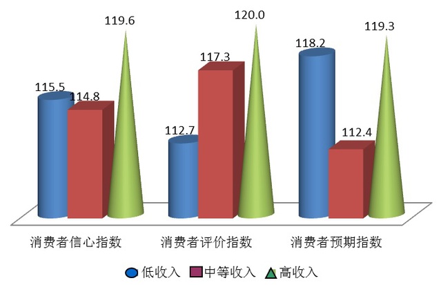 调查数据发现,本季度在全体被调查者的各项主要指数环比均为负的情况下,一些分类指数的变化出现了分歧。低收入群体对经济形势的预期环比大幅提高了12.8点,但同时其收入预期环比却大幅下降了12.9点,购买意愿亦随之大幅下降,说明低收入群体的生活现状并不乐观,该群体包含了生活困难和老年消费者,因此应增强其对相对收入稳定的预期;而中等收入群体大部分指数出现大幅回落,但对收入和就业现状相对较为满意,特别要注意的是该群体的购买意愿指数和购买预期指数环比大幅下降了15.5和22.5点,这说明中等收入群体对经济中出现的不确定因素交为敏感,抵御风险的能力有待增强,同时在拉动内需促进消费的过程中要提升该群体稳定持续消费的能力。
