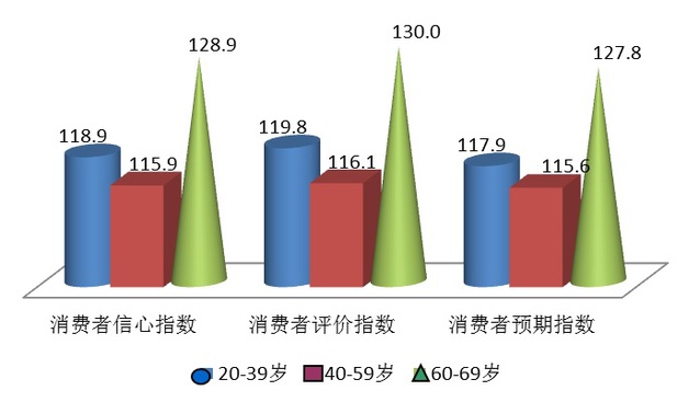 在分年龄段的调查中,老年消费者在三项指数中得分远超中年轻群体,分别为128.9、130.0和127.8点;而40—59岁年龄段消费者的各项指数均垫底,信心指数、评价指数和预期指数分别为115.9、116.1和115.6点;20—39岁年龄组的各项指数分别为118.9、119.8和117.9点。本季度的调查结果中,中青年群体各项指数环比均为负,且下降幅度较大,反映出中青年消费者的信心在本季度出现了大幅度的波动,而老年消费者各项指数大多出现了大幅度回升,从而拉高了总体指数,只有购买意愿指数和购买预期指数所有群体均呈现负增长,尤其值得关注的是中年群体该两项指数环比分别下降了11.7和18.1点,说明中年消费群体因为其在子女教育、医疗和养老等方面面临的支出较大,所以在对经济的预期出现波动时会大幅缩减购买需求,因此该群体在收入和就业方面的需要更为稳定的预期。