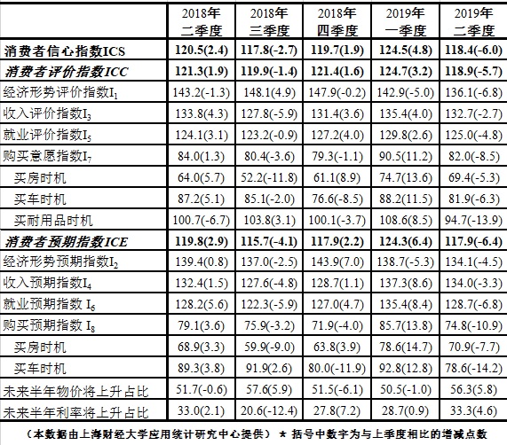 附表一 2019年第二季度上海财经大学上海市消费者信心指数及分类指数