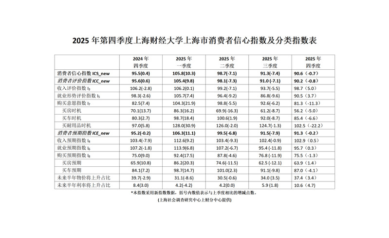 上海财经大学消费者信心指数2024年第4季度-2025年第4季度指数情况表