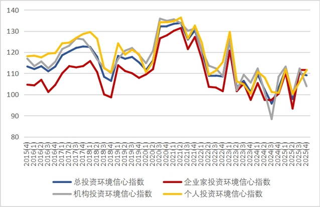 如图1所示,本季度投资环境信心指数的三个分类指数呈现两升一降态势:企业家投资环境信心指数为111.7点,环比上升0.1点,与上季度基本持平,同比上升11.4点;机构投资者投资环境信心指数为103.9点,环比下降8.4点,同比下降4.5点;个人投资者投资环境信心指数为111.6点,环比上升5.7点,同比上升10.9点。