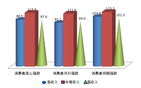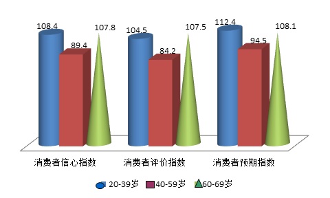 本季度分年龄段的调查结果为,青年群体的指数相对较高,依次分别为108.4点、104.5点和112.4点,环比均上涨,幅度分别为3.1点、0.5点和5.6点;中间年龄段的消费者在三项主要指数中均垫底,分别为89.4点、84.2点和94.5点,都低于了中性值100点,相比上个季度也是继续下降,分别为5.9点、7.9点和3.8点;老年消费群体的各项指数较为均衡,分别为107.8点、107.5点和108.1点,均位于中性值以上。同时调查组分析发现,中年消费者和老年消费者的就业评价和就业预期指数环比下降幅度较大,其中,中年消费群体的就业评价和就业预期指数分别为81.7点和93.2点,环比分别下降了16.4点和12.7点,说明该群体抵御冲击的能力较为薄弱,其对经济发展的信心略显不足,应针对该群体的就业状态予以特别的关注,并适当考虑采取必要的措施稳定其对就业和收入的信心。
