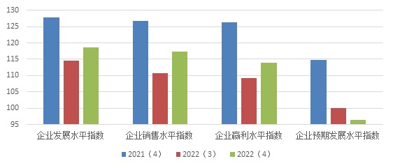 上海市企业家投资信心指数反映企业家对于本企业生产经营现状的满意程度和对未来的预期。如图3所示,本季度企业家投资信心指数的分类指数呈现三升一降态势,其中表现当前企业发展状况的企业发展水平信心指数为118.64点,环比上升4.13点,同比下降9.09点;反映企业销售水平的企业销售水平信心指数为117.37点,环比上升6.70点,同比下降9.26点;企业盈利水平信心指数为113.98点,环比上升4.73点,同比下降12.22点。企业预期发展水平信心指数为96.40点,环比下降3.73点,指数跌入悲观区域,同比下降18.34点。