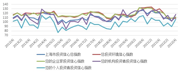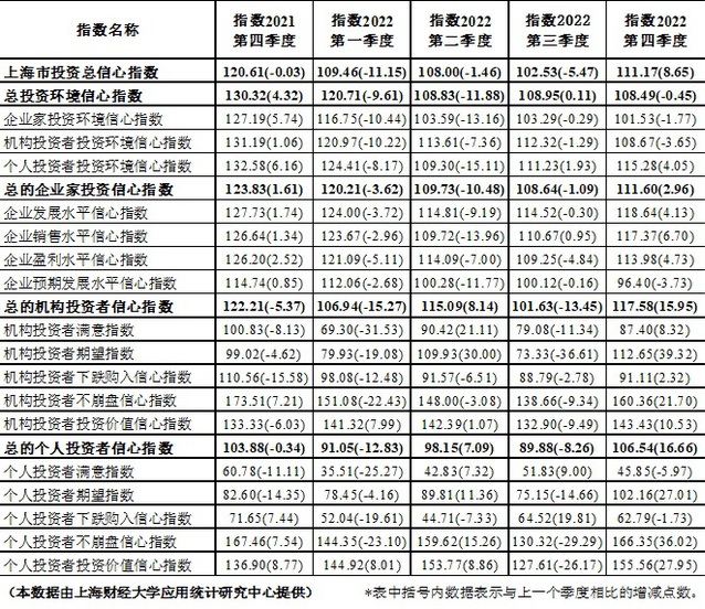 根据上海社会调查研究中心上财分中心和上海财经大学应用统计研究中心对上海市企业领导人或企业家、机构投资者和个人投资者的调查结果显示,2022年第四季度上海财经大学上海市投资者信心指数为111.17点,环比上升8.65点,同比下降9.43点。指数上升,表明投资者信心较上季度有所增强。