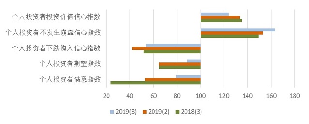 如图6所示,第三季度个人投资者信心指数的分类指数大多呈现了上升态势。其中,个人投资者满意指数为79.40点,较上季度大幅上升26.74点,同比上升55.57点;个人投资者期望指数为88.95点,环比上升24.10点,同比上升24.10点;个人投资者下跌购入信心指数为53.59点,比上季度上升11.80点,同比上升1.80点;个人投资者不崩盘信心指数为163.45点,比前一季度上升10.54点,同比上升14.30点;本季度个人投资价值信心指数为123.72点,环比下降9.79,同比下降11.32点。