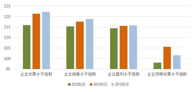 上海市企业家投资信心指数反映了企业家对于本企业生产经营现状的满意程度和对未来的预期。如图4所示,2019年第三季度上海市企业家投资信心指数为114.61点,环比持平,同比上升3.69点。本季度企业家投资信心指数的分类指数较为稳定,其中表现当前企业发展状况的企业发展水平信心指数为122.16点,与上季度基本持平,同比上升6.17点;反映企业销售水平的企业销售水平信心指数为118.79点,环比上升1.21点,同比上升3.52;企业盈利水平信心指数为115.85点,环比持平,同比上升1.44点。企业预期发展水平信心指数为101.62点,环比下降3.96,同比上升3.61。