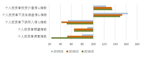 如图7所示,第三季度个人投资者信心指数的分类指数大多呈现了上升态势。其中,个人投资者满意指数为79.40点,较上季度大幅上升26.74点,同比上升55.57点;个人投资者期望指数为88.95点,环比上升24.10点,同比上升24.10点;个人投资者下跌购入信心指数为53.59点,比上季度上升11.80点,同比上升1.80点;个人投资者不崩盘信心指数为163.45点,比前一季度上升10.54点,同比上升14.30点;本季度个人投资价值信心指数为123.72点,环比下降9.79,同比下降11.32点。