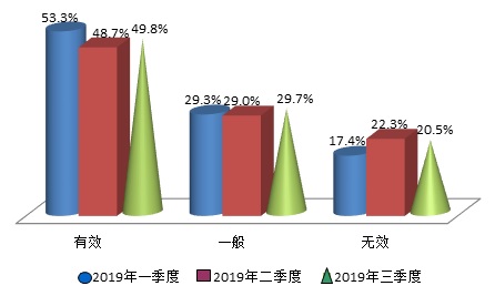 在本季度的调查中,49.8%的受访者认为房地产市场调控的政策有效,环比略提高1.1个百分点,比去年同期大幅上涨了8.9个百分点;而只有20.5%的消费者对该项工作的评价投了不满意票,环比减少了1.8个百分点,同比下降了7.3个百分点。本季度消费者对调控效果的满意度依然维持在较高的水平,近半数的消费者认为本轮调控的力度和持久性都强于以往,本季度政府再次向消费者传递了房地产的居住定位,房地产正逐步过渡到平稳发展新阶段,回归其居住需求属性,因此今年以来消费者对该项调控政策的有效性一直处于调查以来的高点位。