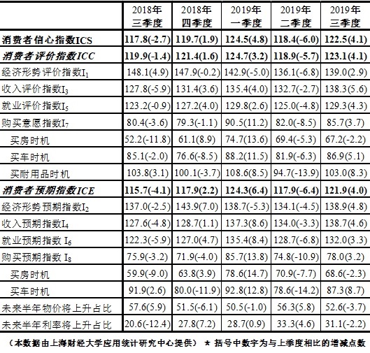 附表一 2019年第三季度上海财经大学上海市消费者信心指数及分类指数