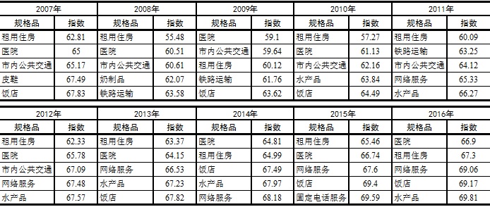 与2015年相比,30个规格品满意度指数12升18降。按照升幅从高到低排列,位于前5位的是:租用住房、固定电话服务、移动电话服务、网络服务和奶制品,其满意度指数分别上升了1.84点、1.52点、1.49点、1.46点和1.34点。按照降幅从高到低排序,位于前5位的是:蔬菜、电、电冰箱、电视节目、书报杂志,其满意度指数分别下降了1.52点、1.51点、1.12点、1.06点和1.02点。