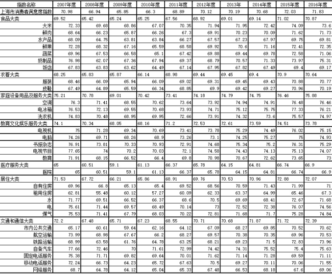 上海财经大学应用统计研究中心主任徐国祥教授还指出:虽然交通和通信类、医疗服务类满意度指数的增加促使2016年上海市消费者满意度指数维持历史高位。但与此同时,居住类、教育文化娱乐服务类、家庭设备用品及服务类、衣着类、食品类满意度指数均有不同程度的下降,尤其是居住类和教育文化娱乐服务类满意度指数的下降,推动了2016年上海市消费者满意度指数的回落。