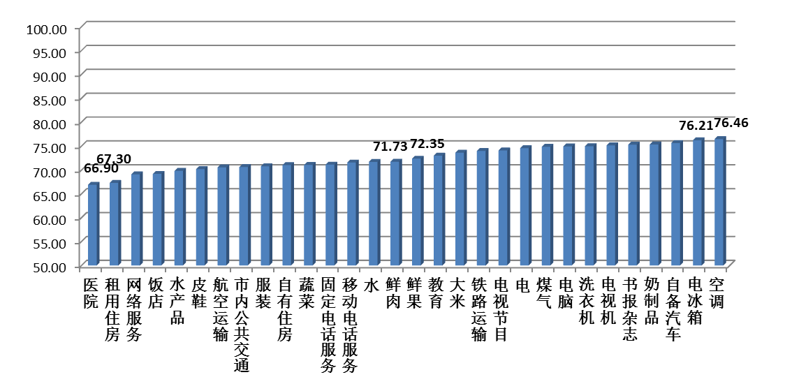在被调查的30个规格品中,按照满意度指数从高到低排序,排名位于前5位的分别为:空调满意度指数76.46点;电冰箱满意度指数76.21点;自备汽车满意度指数75.63点;奶制品满意度指数75.31点;书报杂志满意度指数75.29点。排名位于后5位的分别为:医院满意度指数66.90点;租用住房满意度指数67.30点;网络服务满意度指数69.06点;饭店满意度指数69.17点;水产品满意度指数69.81点。这说明上海市民对空调、电冰箱、自备汽车、奶制品和书报杂志最满意,对医院、租用住房、网络服务、饭店和水产品最不满意。参见图2。
