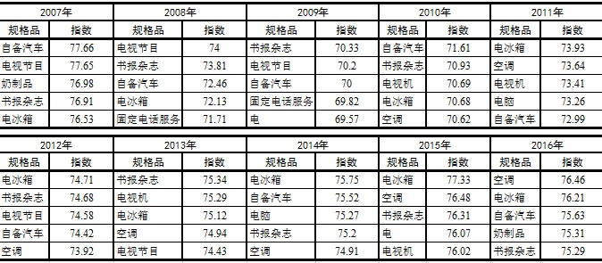 附表2 2007年至2016年,排名前5位的规格品及其满意度指数