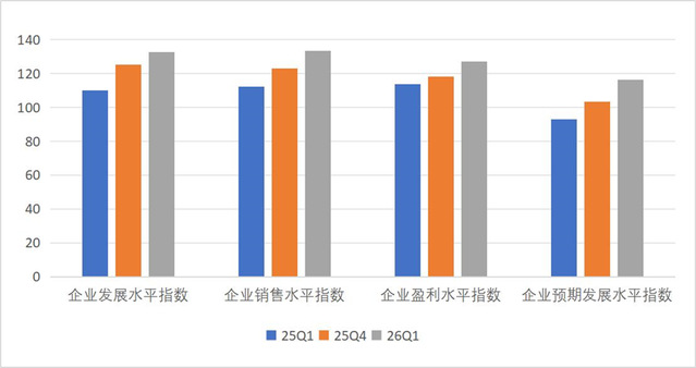 上海社会调查研究中心上财分中心指数研究团队认为,2026年第一季度企业家投资信心指数显著回升,且发展、销售、盈利与预期四项分类指数全面上行,表明企业对当前经营状况和后续发展前景的评价均有所改善,呈现出“当前经营改善与未来预期修复并进”的特征。其一,企业发展和销售水平信心继续走强,说明随着稳增长、扩内需、稳预期政策效应持续释放,市场需求对企业经营的支撑有所增强,企业对生产经营环境的感受较上季度明显改善。其二,企业盈利水平信心明显回升,表明前期稳增长、降成本和改善融资环境等因素正逐步向经营绩效传导。2026年1—2月份,全国规模以上工业增加值同比增长6.3%,固定资产投资同比增长1.8%,规模以上工业企业利润同比增长15.2%;3月份制造业PMI升至50.4%,生产指数和新订单指数均高于临界点,这些变化在一定程度上增强了企业家对经营恢复和市场改善的判断。其三,企业预期发展水平升幅较大,反映出企业对年初订单、投资安排和后续市场环境的判断趋于积极。不过也要看到,外部环境变化、行业竞争加剧以及部分行业价格压力仍然存在,企业家信心能否进一步转化为更持续的资本开支和用工扩张,仍有赖于需求修复、盈利改善和市场预期的进一步稳定。