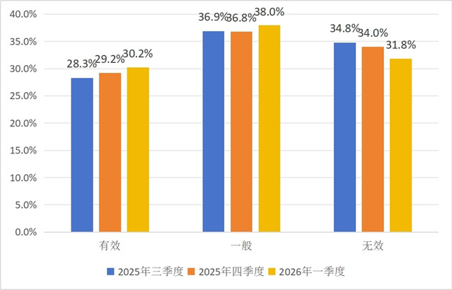 在房地产调控效果评价方面,2026 年第一季度:认为调控“有效”的受访者占比30.2%,环比下降1.0百分点,同比下降11.5个百分点;认为效果“一般”的占比38.0%,环比基本持平,略上升1.2个百分点,同比下降2.9个百分点;认为调控“无效”的占比31.8%,环比下降2.2个百分点,同比上升14.4个百分点。本季度受春节假期影响,上海房地产市场供需仍处低位,前期支持政策效应逐步消化,政策综合效应开始显现,超六成消费者对调控效果持正面或中性态度。