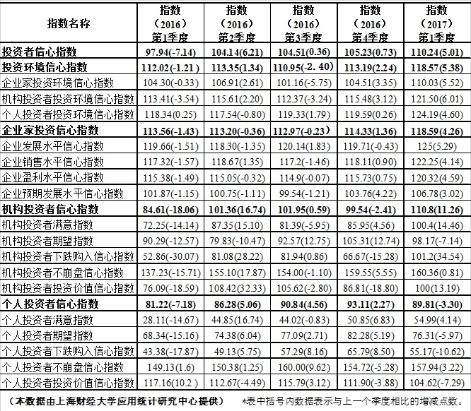 2016年1季度-2017年1季度上海财经大学上海市投资者信心指数情况表