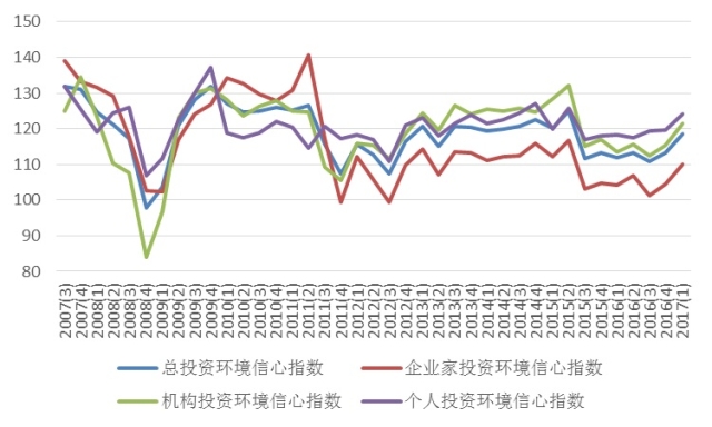 图2 上海财经大学2007年3季度至2017年1季度上海市投资环境信心指数图