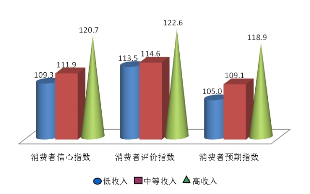 根据上海财经大学应用统计研究中心和上海社会调查研究中心上财分中心最新调查结果显示,2017年第一季度上海市中等收入群体消费者的信心显著提高,使得各项主要指数再度回复到随收入水平的提高而增加的状态。本季度低收入群体消费者信心指数为109.3点,而中高收入群体分别为111.9点和120.7点;消费者评价指数的情况为低收入群体为113.5点,中等收入消费者为114.6点,高收入消费者为122.6点,而消费者预期指数低中高收入群体分别为105.0点、109.1点和118.9点。同时高收入群体与低收入群体的各项主要指数的差距也被拉大。