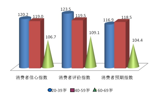 本季度在分年龄段的调查中,中间年龄段的消费者的三项主要指数比以往表现突出,缩小了与20-39岁消费群体的差距,分别为119.0点、119.5点和118.5点;20-39岁消费群体的三项指数分别为120.2点、123.5点和116.9点;老年消费群体即60—69岁年龄组的各项指数明显低于中青年消费者,分别为106.7点、109.1点和104.4点。从各年龄段的指数变化上来看,老年消费者多项指数环比均大幅下滑,依上图次序环比依次下降了7.2点、3.1点和11.3点,其购买意愿和预期指数环比更是出现巨大减幅,分别为25.8点和42.6点;而中年群体的各项指数环比则大多为正,且在三个群体中涨幅最大,只有购买意愿指数和购买预期指数出现下降,分别为7.7点和11.8点,但就业形势评价指数和就业预期指数则大幅增加了21.7点和25.7点,在收入类指数中也有较好表现。上海市本季度的经济运行 “稳中有进”,使得中青年消费群体的信心也随之坚定,尤其是伴随收入分配政策的调整完善和资产类价格的上涨,中年消费群体的信心得以逐步增强。
